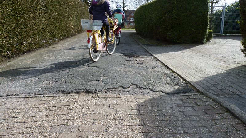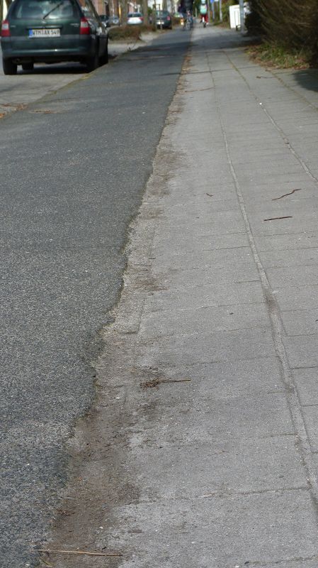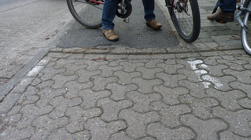 Verschiedene Höhen des Straßenbelags zwischen Fahrrad- und Fußweg ergeben fahrlässige Unfallrisiken. Quer zur Fahrtrichtung verlaufende Stufen durch einmündende Grundstückseinfahrten und Nebenstraßen lassen Straßenplaner vermuten, die möglicherweise nicht im Besitz eines Fahrrades sind. Die Belastung durch permanente Stöße beim Queren von Rillen und Stufen quer zur Fahrradfahrbahn machen das Benutzen zur Tortur.